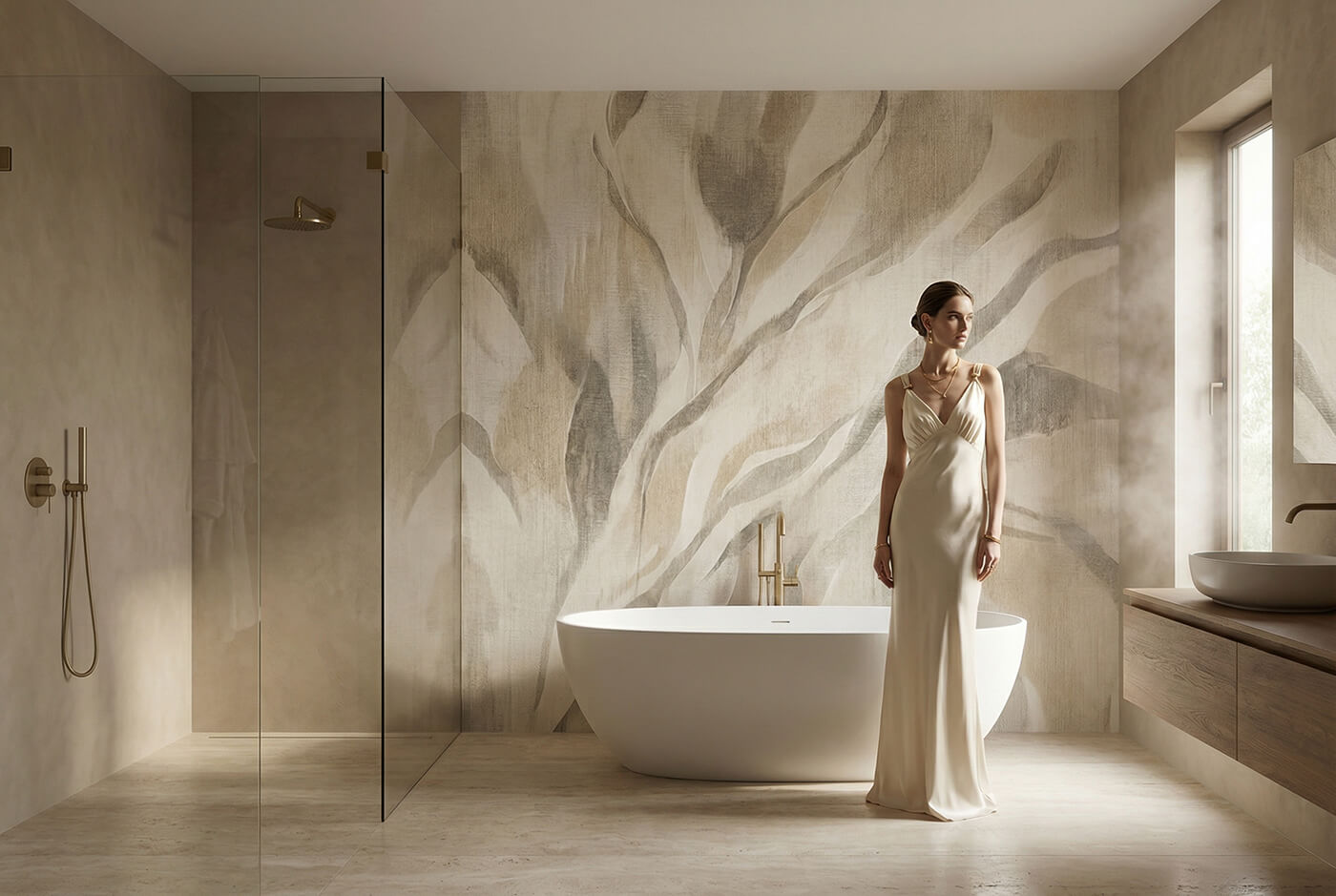 Fototapeta VELUM drukowana jest na profesjonalnych podłożach Walldecor, przeznaczonych do fototapet na wymiar. Dostępne są eleganckie, matowe i subtelnie strukturalne wykończenia, a także systemy Aqua do zastosowania w łazienkach, strefach prysznicowych i spa.