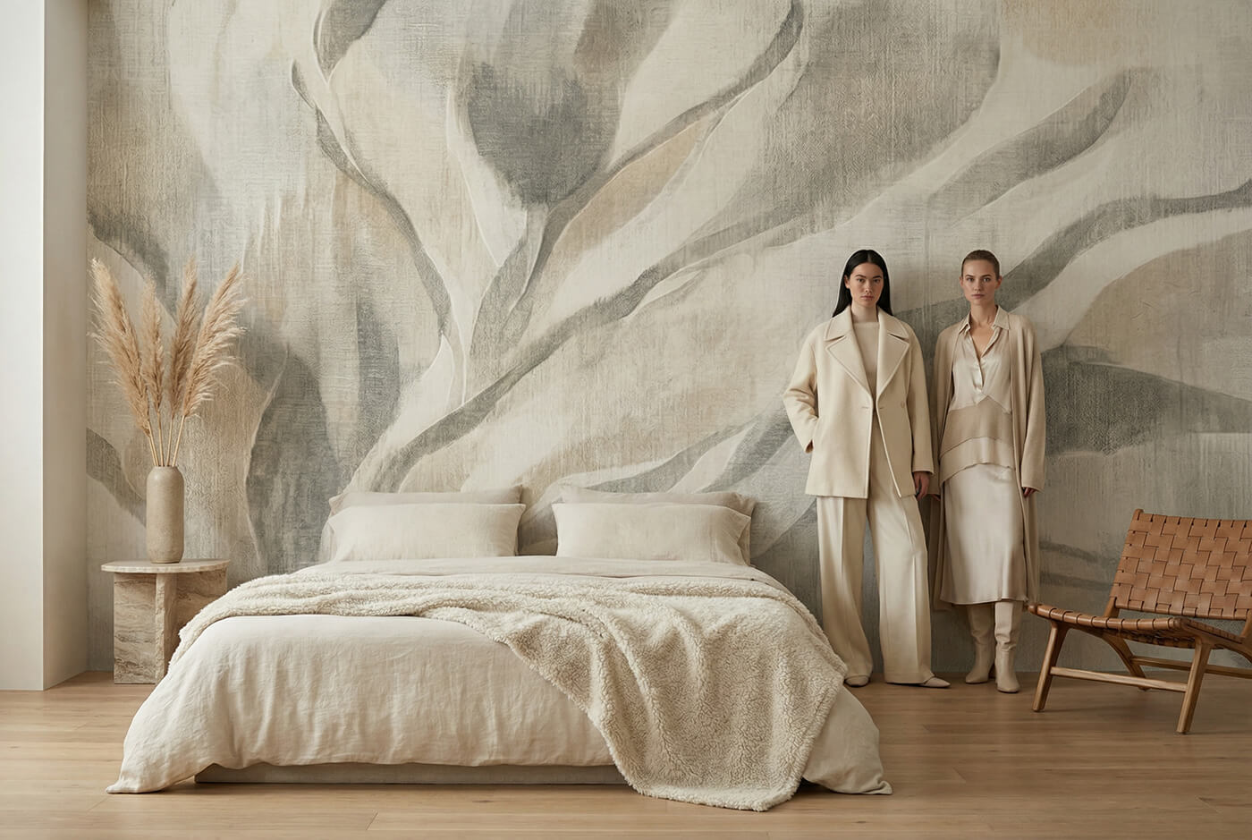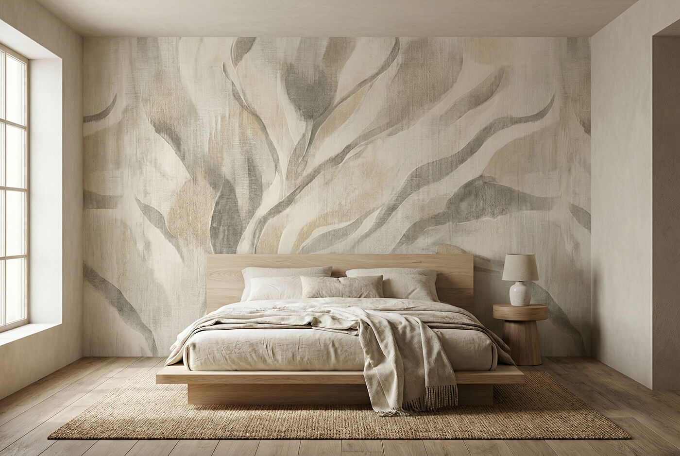 Motyw roślinny w VELUM jest subtelny i miękki – inspirowany naturą, ale bez dosłowności. Dzięki temu ta fototapeta z motywem roślinnym dobrze odnajduje się w aranżacjach nowoczesnych, japandi, skandynawskich oraz w estetyce modern organic.