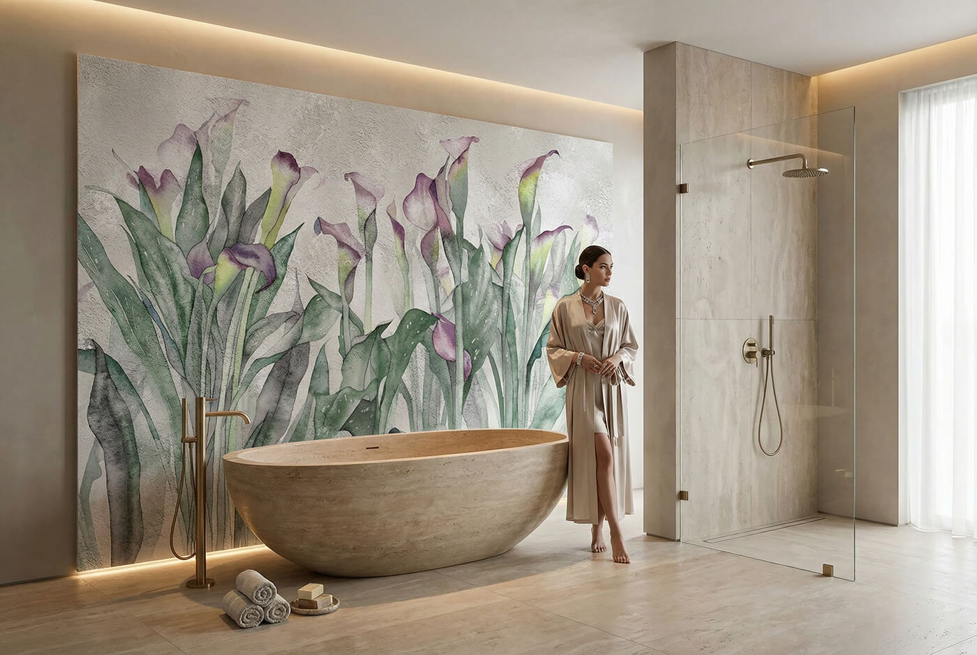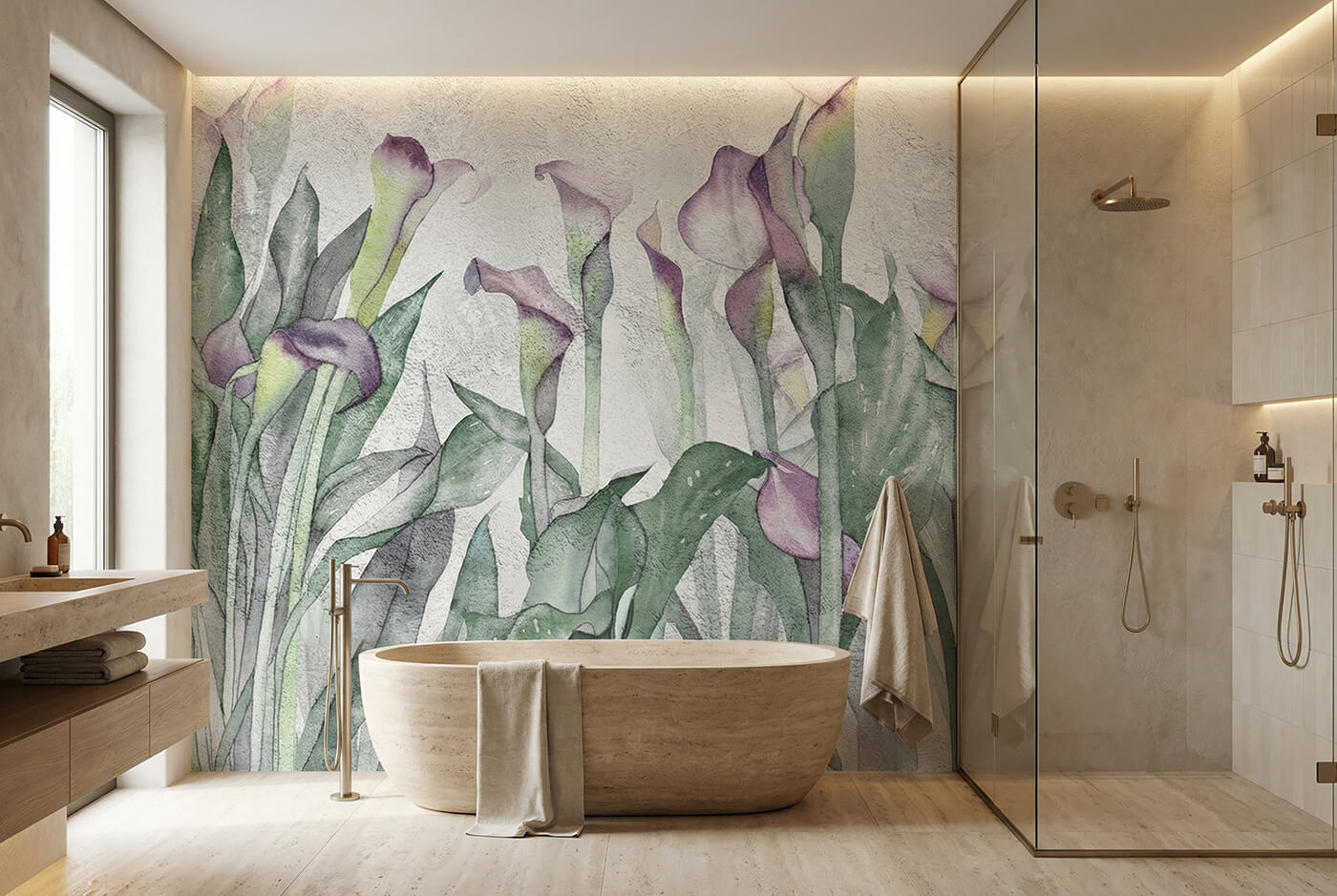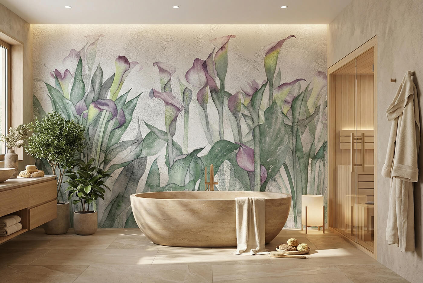 Subtelna grafika roślinna wprowadza do łazienki wizualną lekkość i porządek. Zamiast fug i płytek otrzymujesz jednolitą, gładką powierzchnię muralu, która wypełnia całą ścianę i nadaje wnętrzu spójny charakter.