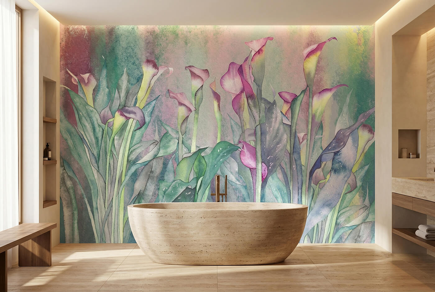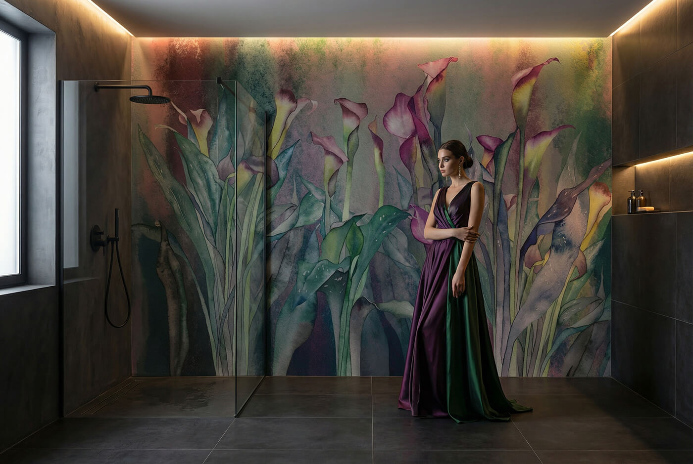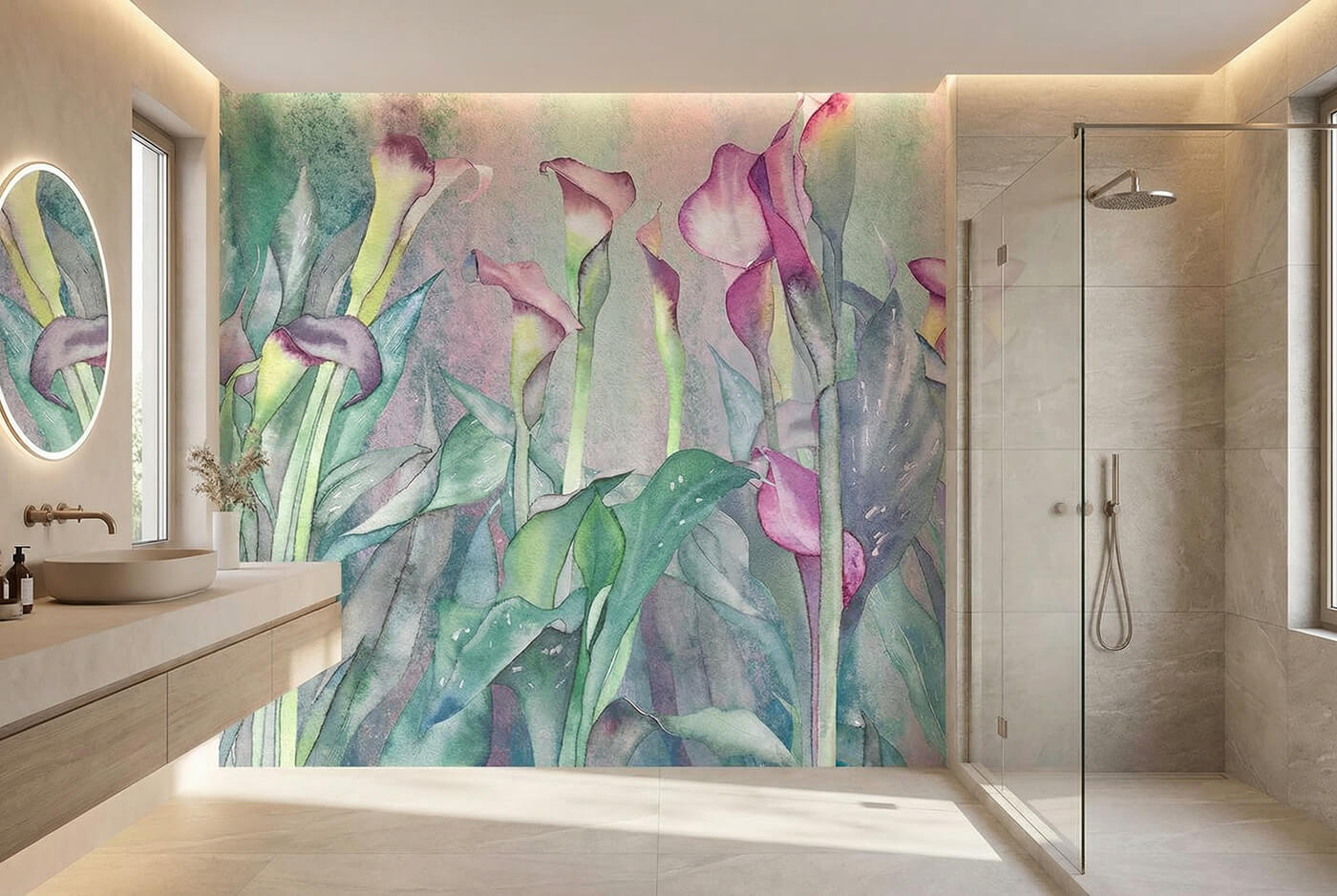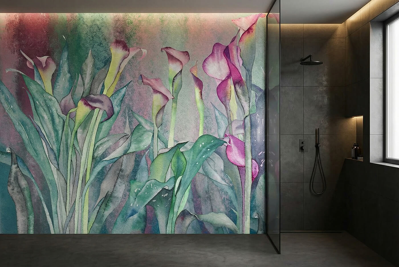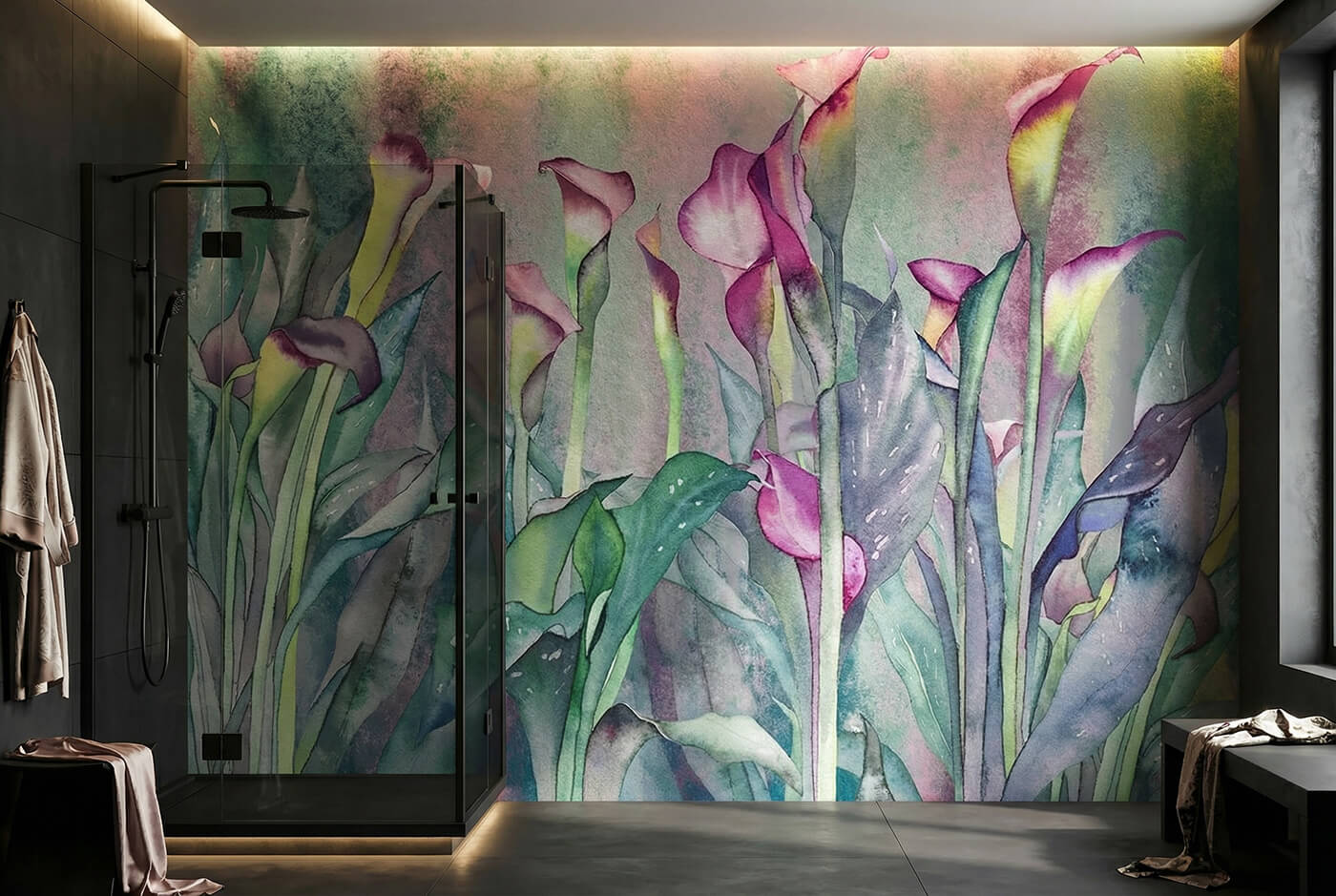 Calla Vivace to fototapeta roślinna zaprojektowana specjalnie do łazienek, kabin prysznicowych i stref spa. Akwarelowe liście i kwiaty kalii wprowadzają do wnętrza naturalny rytm i lekkość, jednocześnie zachowując pełną funkcjonalność w warunkach podwyższonej wilgotności i bezpośredniego kontaktu z wodą.