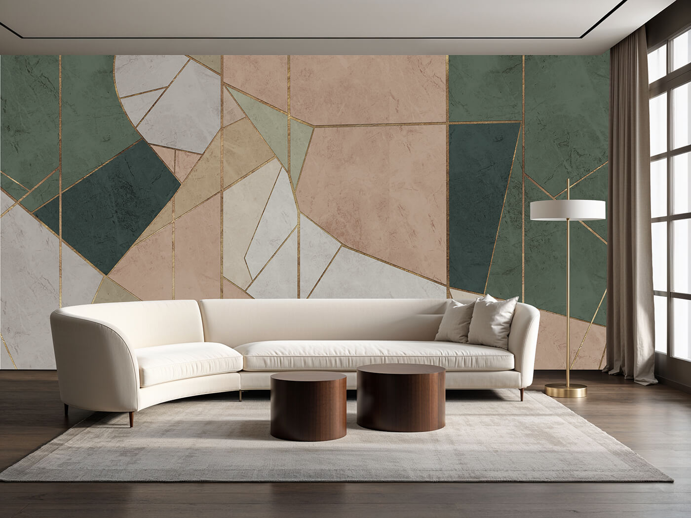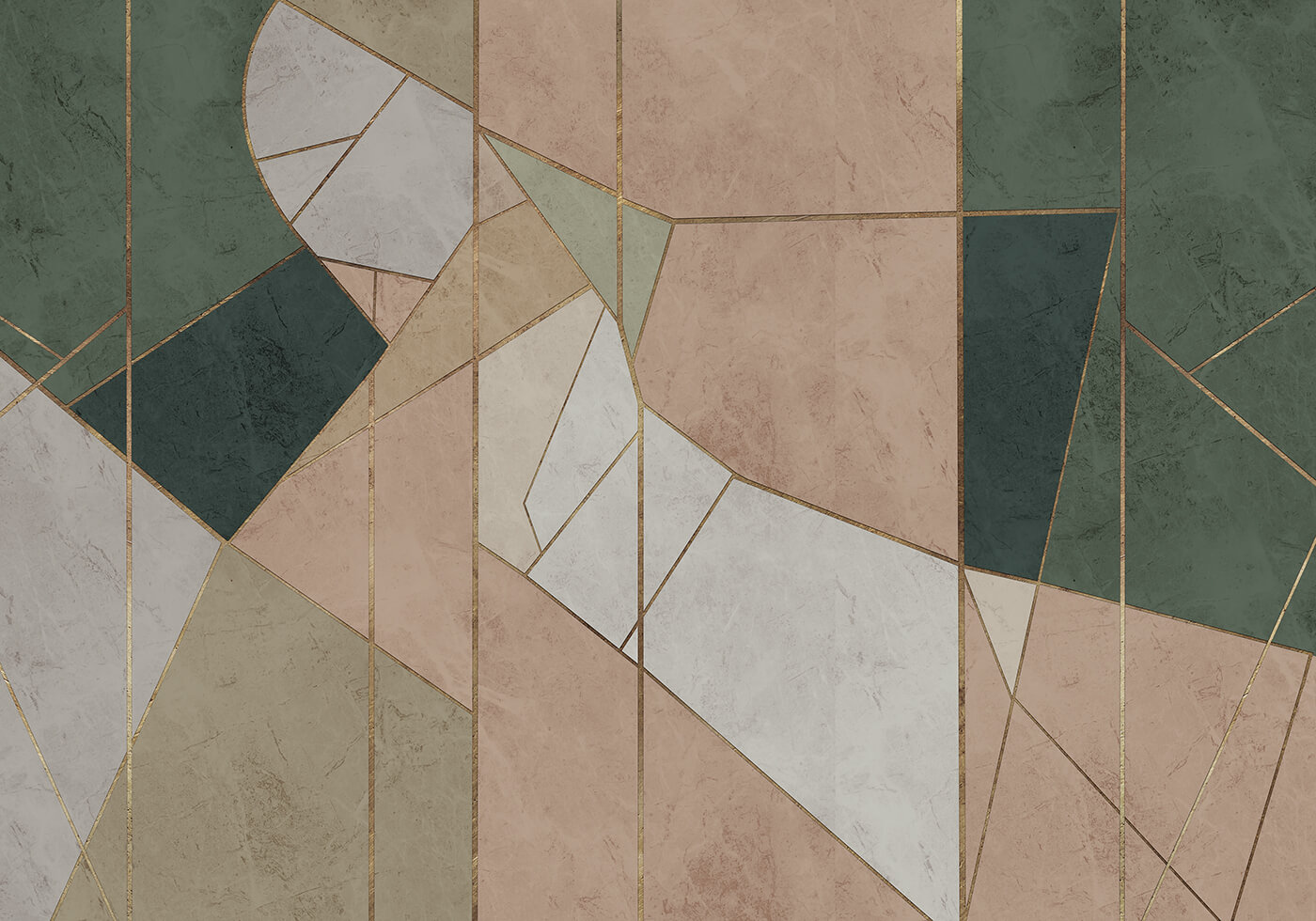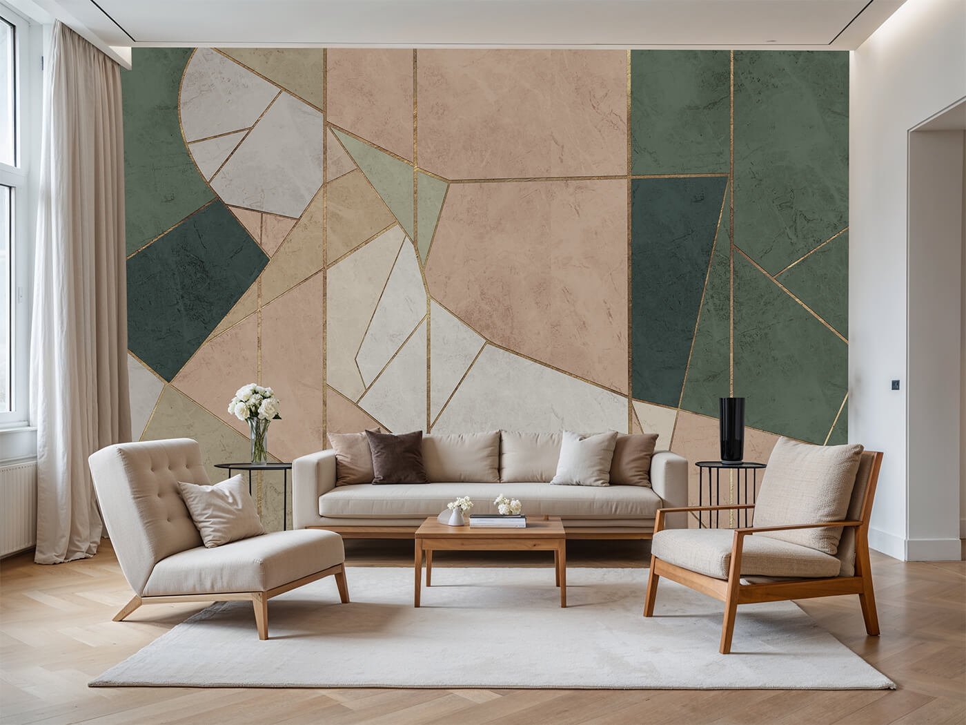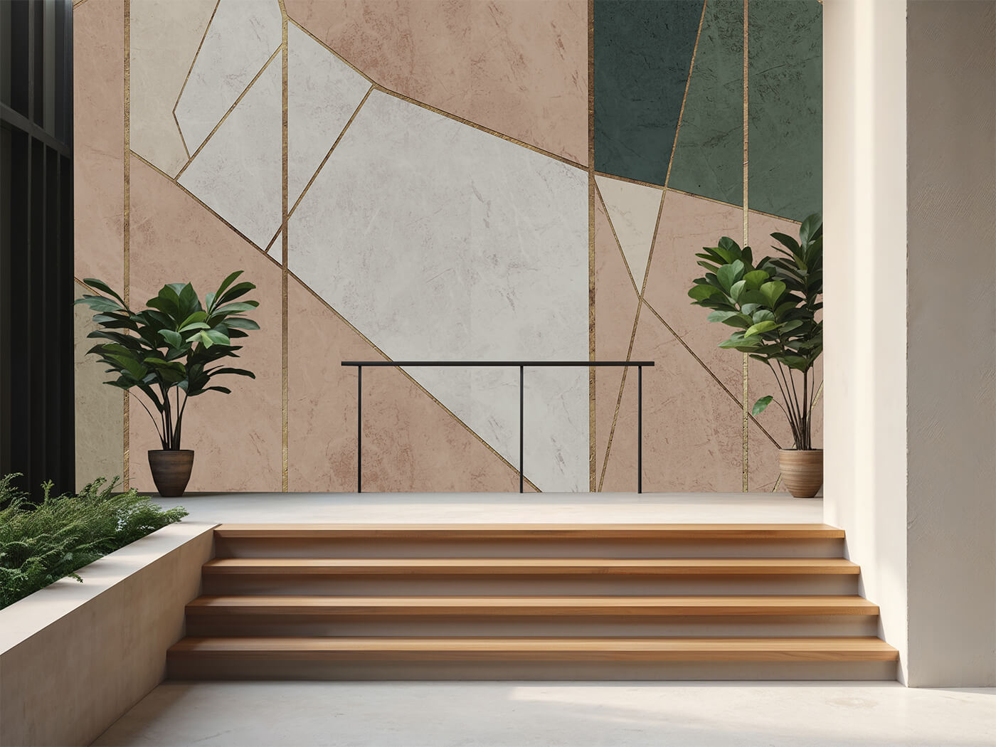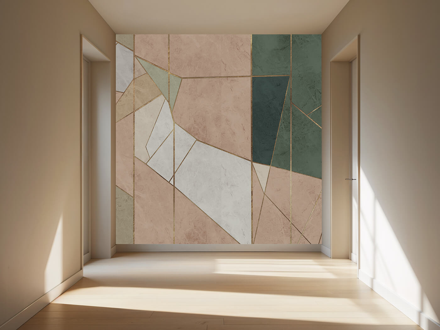 Ritmo Minerale to nowoczesna fototapeta geometryczna na wymiar w odcieniach szałwii, beżu, pudrowego różu i kości słoniowej. Rytmiczne, „złote” linie (efekt druku) porządkują ścianę, wysmuklają ją optycznie i wprowadzają elegancki, architektoniczny akcent. Idealna do salonu, sypialni, jadalni, korytarza, gabinetu i lobby.