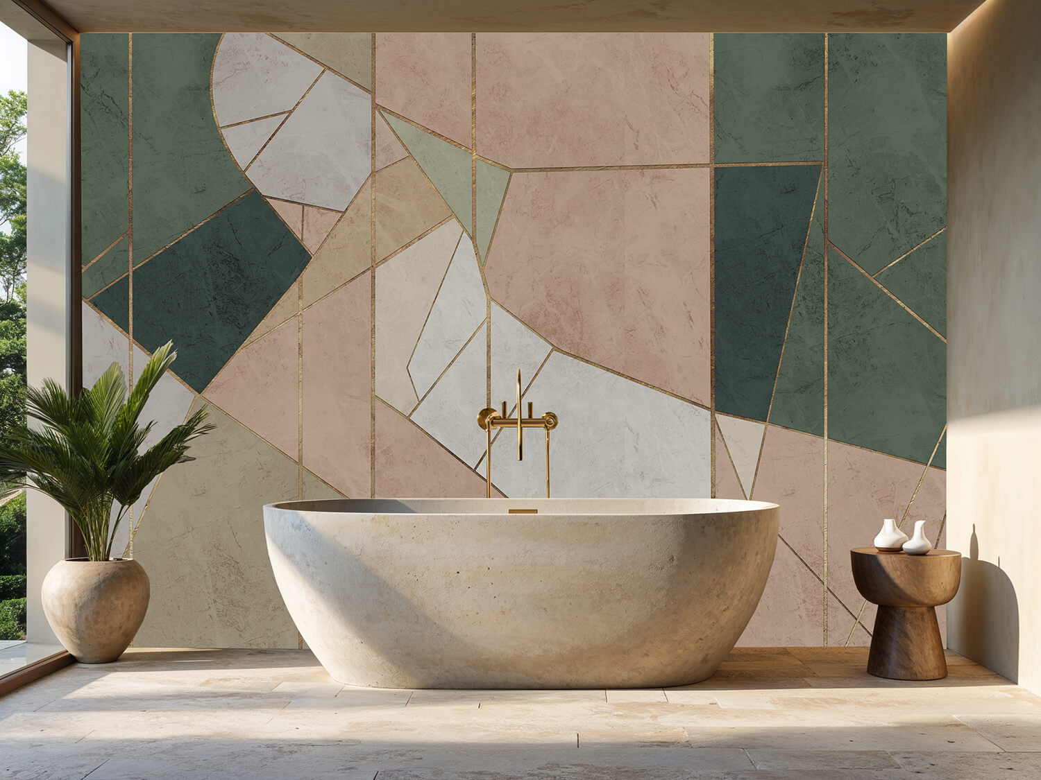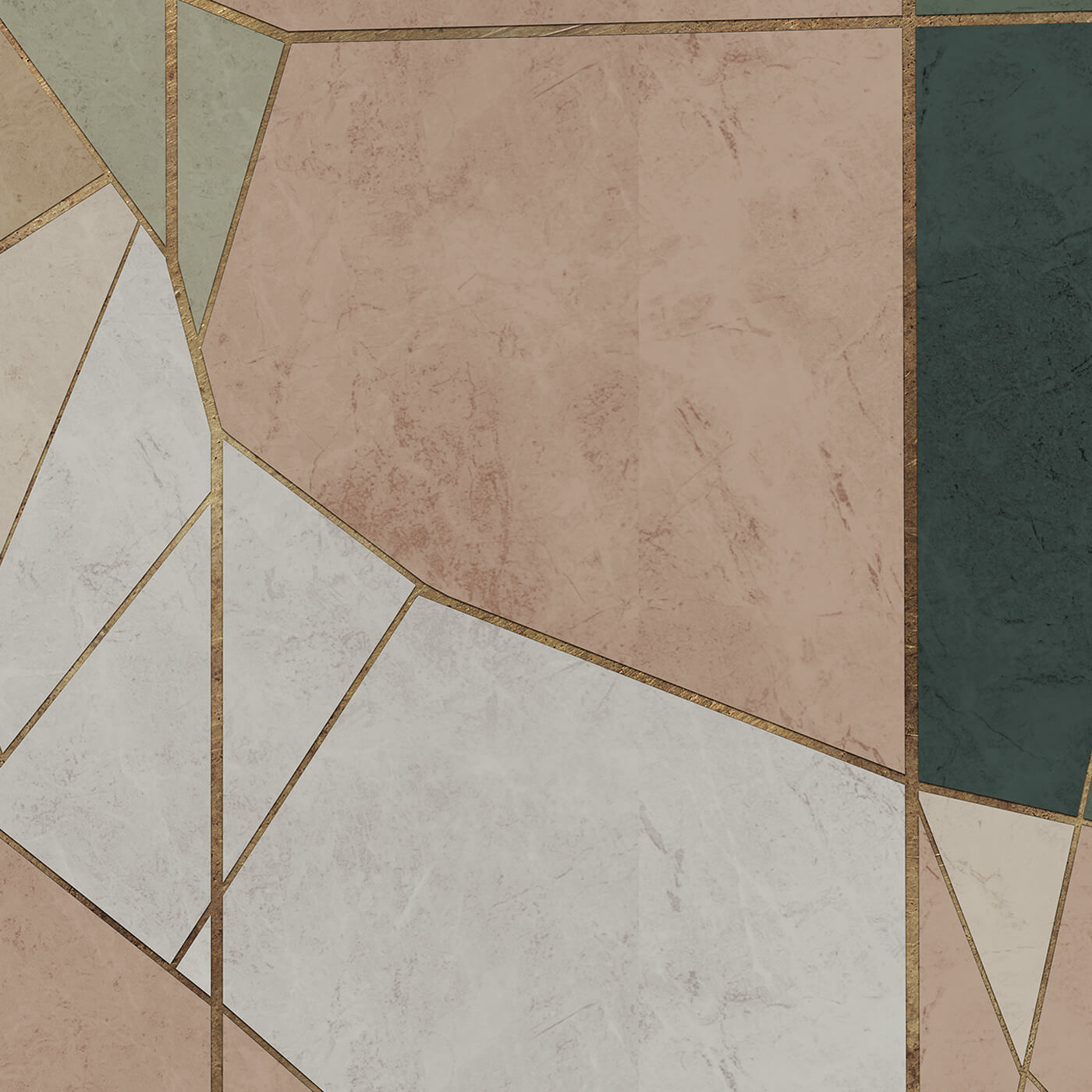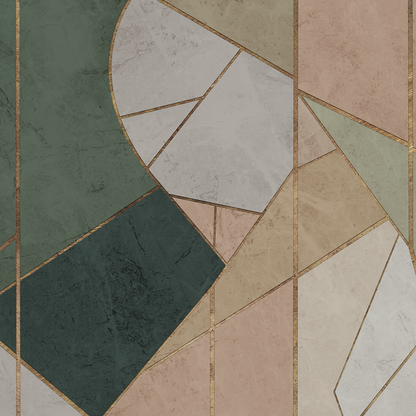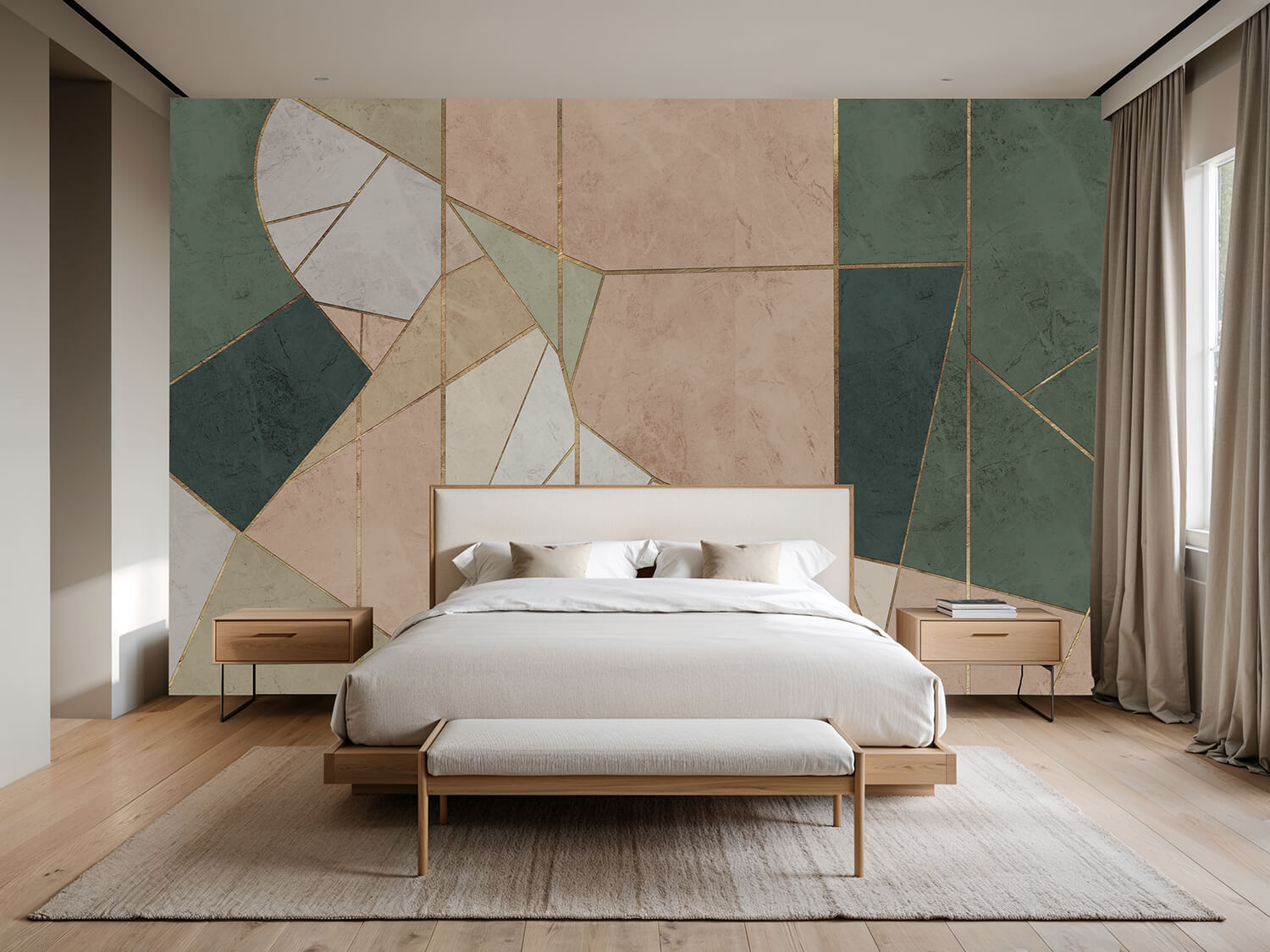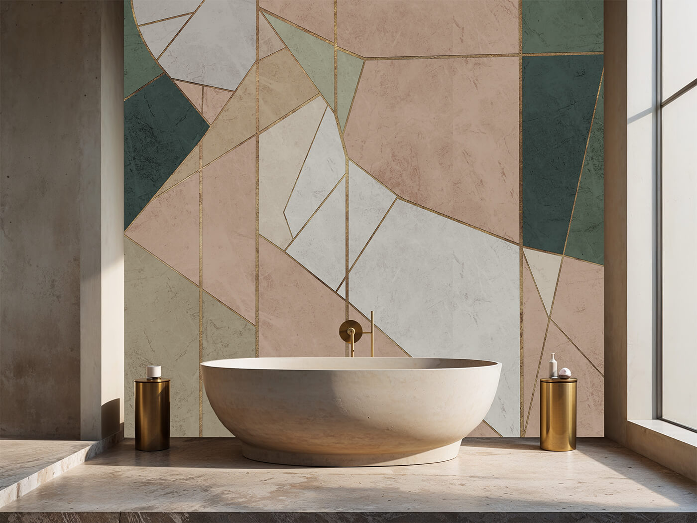 Ritmo Minerale to nowoczesna fototapeta geometryczna na wymiar w odcieniach szałwii, beżu, pudrowego różu i kości słoniowej. Rytmiczne, „złote” linie (efekt druku) porządkują ścianę, wysmuklają ją optycznie i wprowadzają elegancki, architektoniczny akcent. Idealna do salonu, sypialni, jadalni, korytarza, gabinetu i lobby.
