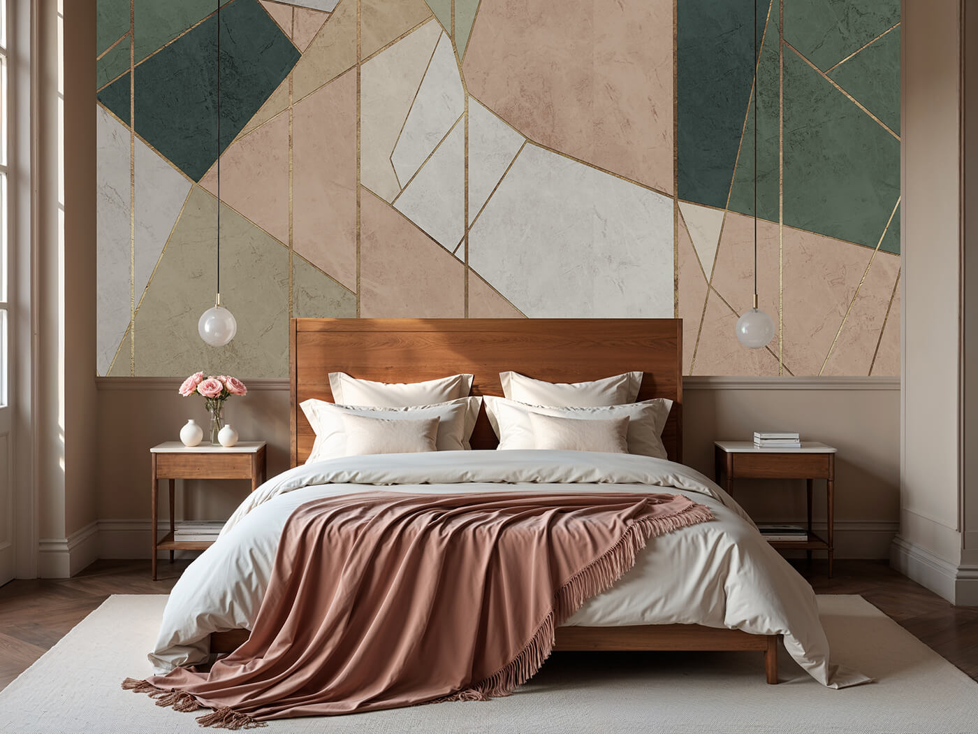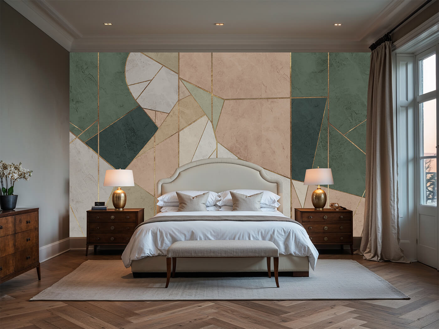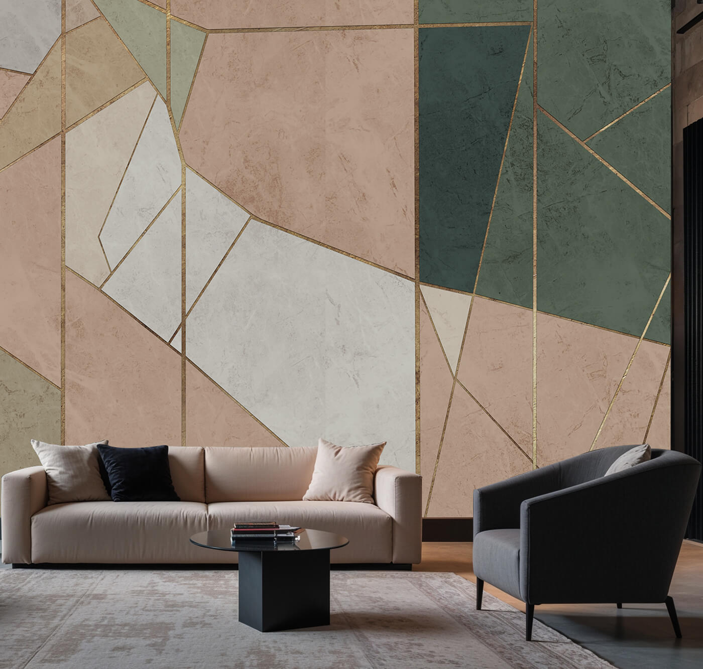 Tak. Ritmo Minerale to fototapeta geometryczna do salonu, sypialni, gabinetu i holu – stonowana paleta i złote linie porządkują przestrzeń, nie przytłaczając jej.